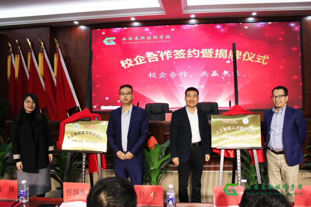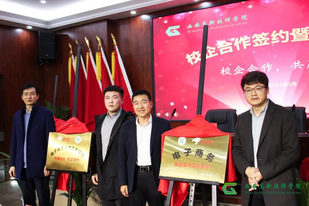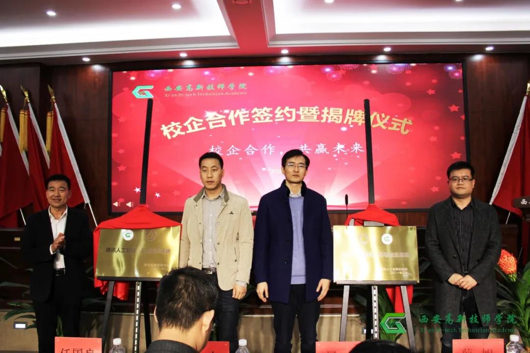 签约仪式完毕后,京东人力资源部总经理蔡旭、人事经理刘实、陕西剋格勃企业管理咨询有限公司副总经理汤乐、苏州利华科技有限公司总经理周游、人事经理王乐玲、腾讯人工智能实验室项目负责人张哲、技术总监王森分别上台与我院副院长任国良、副院长刘肖、集团就业运营部部长罗军,共同为人才培养基地、实习就业基地、战略合作伙伴等牌匾进行揭牌。