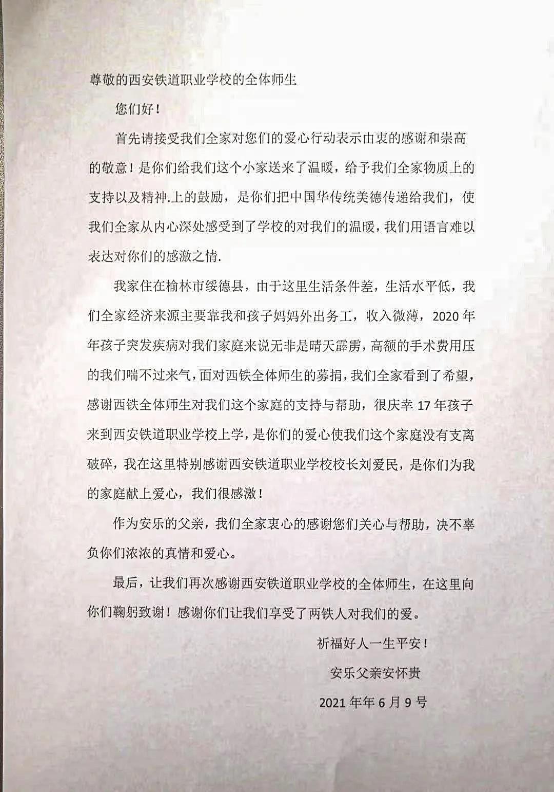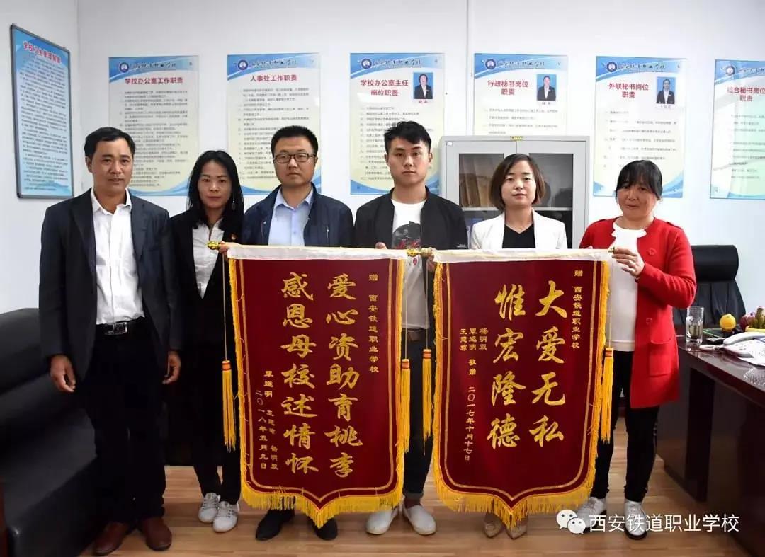“感谢西安铁道职业学校全体师生对我家孩子的帮助,是你们用爱的力量让孩子战胜病魔,让我们全家走出困境......”6月9日下午,我校217级学生安某某家长冒着炎热,满怀感恩之心把一面绣着“人间大爱暖人心,师生情意比海深”的烫金字样的锦旗送到学校,以此感谢全体师生的无私帮助和爱心募捐,感谢老师们对孩子的无微不至的关怀和照顾。言辞热烈,场面感人。校长助理程勇、办公室主任张敏代表全校师生接受锦旗。