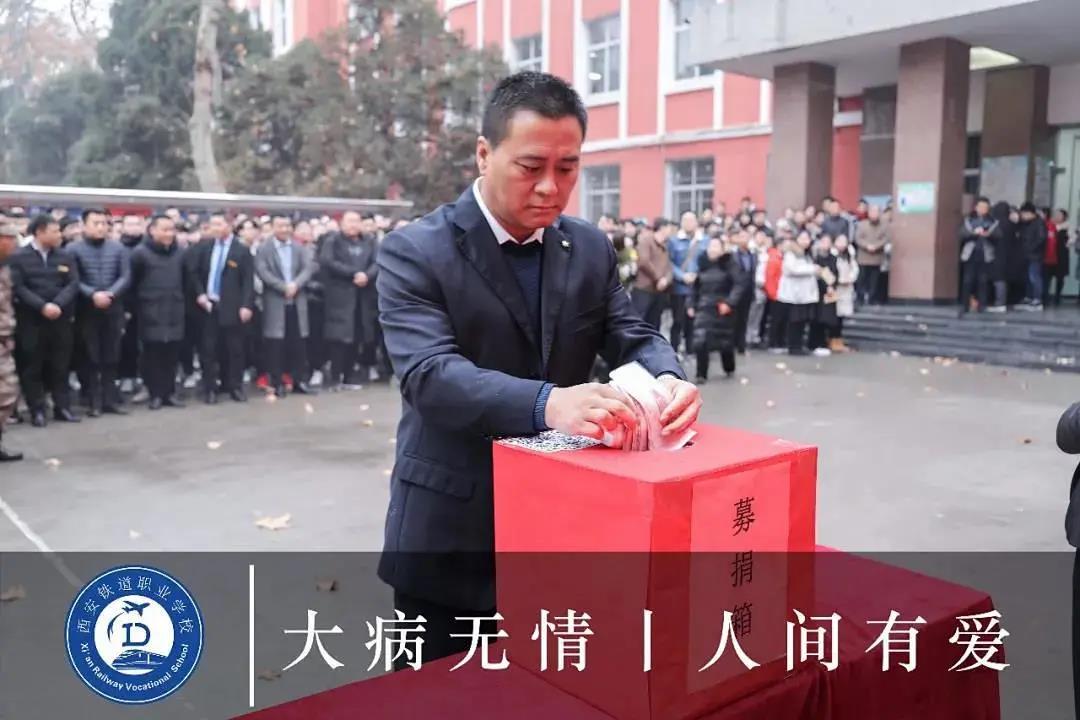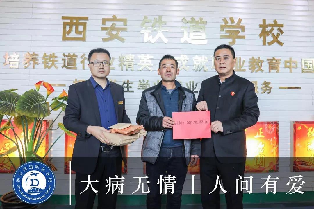 安某某同学本该无忧无虑、享受无限幸福的在学校学习,2019年12月1日周末在家休息,发现鼻中有血液流出,昏迷后送入当地医院检查,由于病情严重化转入西京医院,经专家会诊确认病情为尿毒症,之后需进行换肾手术。前期手术费及治疗费、医药费共需60万左右。给不富裕的家庭罩上一层阴影,家人为昂贵的医药费四处奔波求助。学校全体师生得知情况后,第一时间行动起来,组织全体教师和各班主任在全校范围内发出献爱心募捐倡议。老师们纷纷慷慨解囊,学生们也捧出自己的生活费,积攒的零花钱,投入捐款箱,表达他们的一份心意和祝福。师生募捐到53170.32元。2019年12月26日上午刘爱民校长将募捐到的善款交于家长手中。让身患疾病的安某某同学和家人感受到了来自学校和师生的关心和温暖。