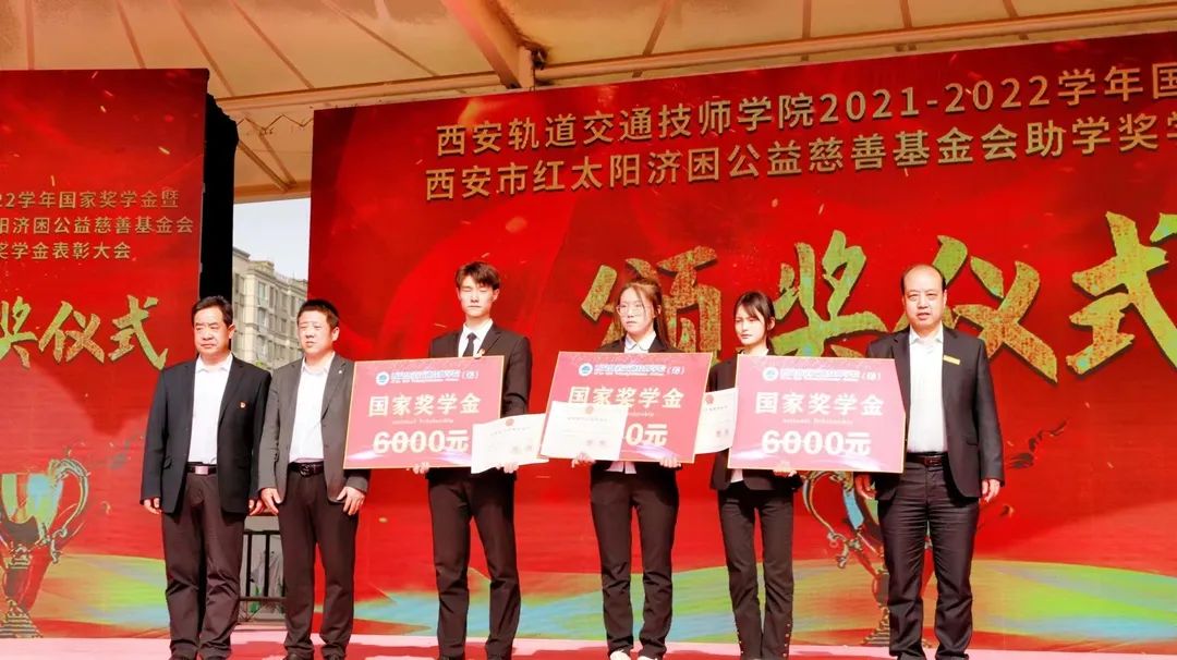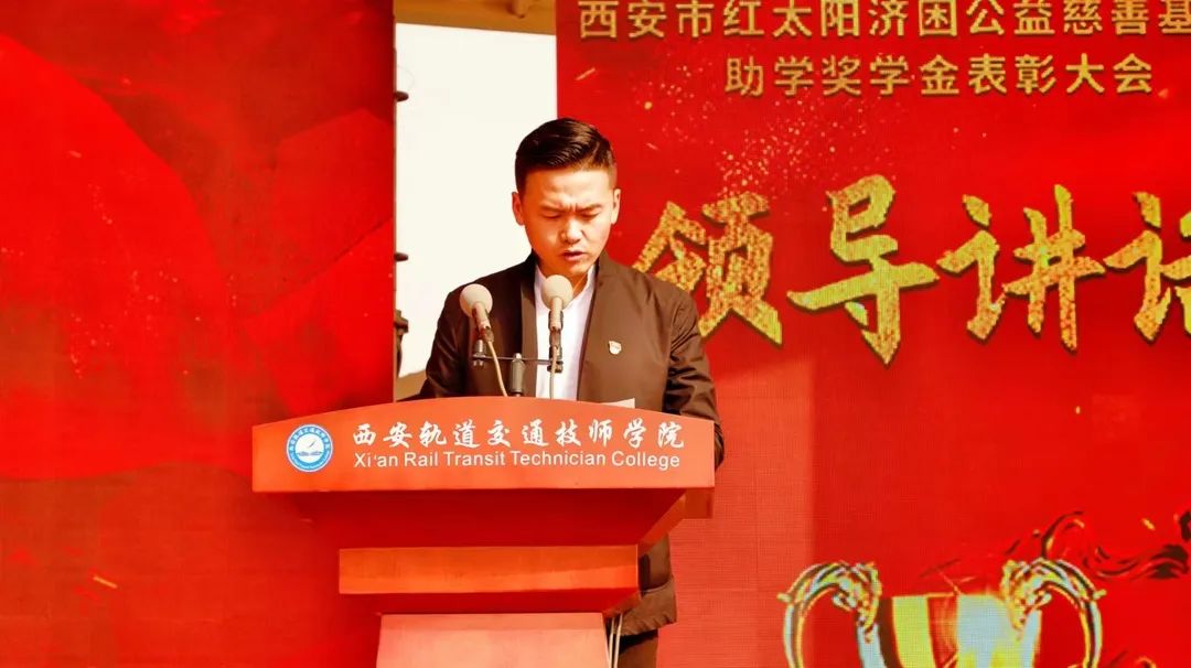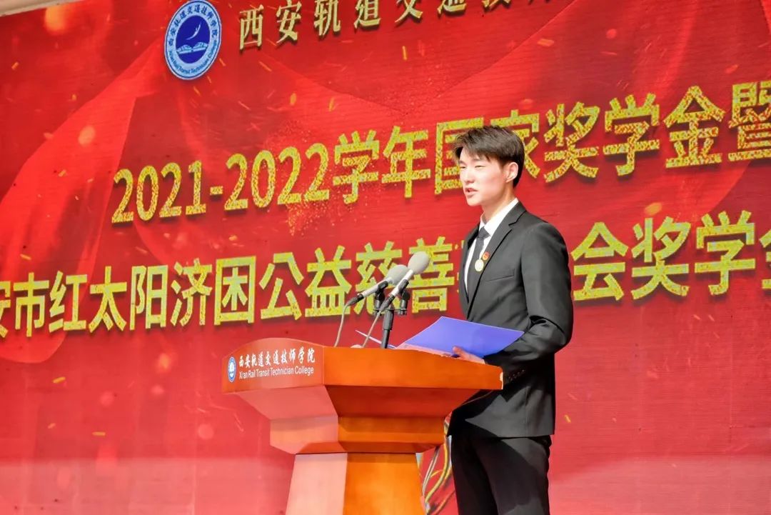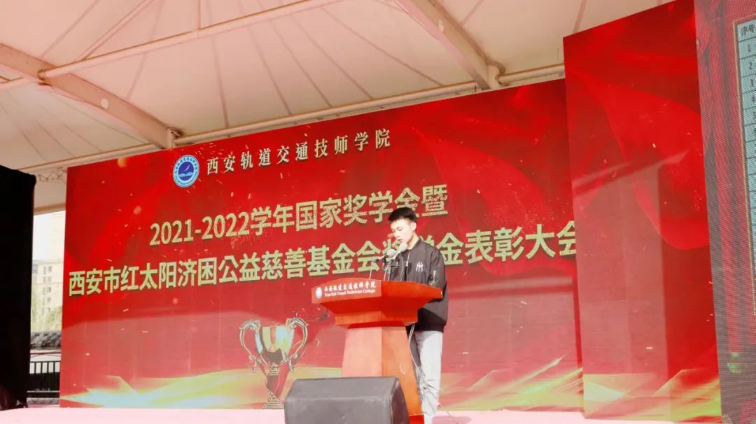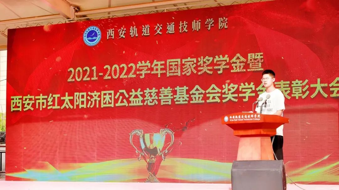 为贯彻落实国家资助育人政策,广泛宣传学院资助育人成效,深化学院三全育人综合改革,4月14日,西安轨道交通技师学院2021—2022学年国家奖学金暨西安市红太阳济困公益慈善基金会奖助学金表彰大会在校运动场上隆重举行。西安市红太阳济困公益慈善基金会秘书长葛秀、院党支部书记、副院长孙原、督导办主任曹向阳、学生处处长李开宁和其他相关处室负责人、基金会相关工作人员以及全体在校生共同参加了此次表彰大会。大会由学生处副处长刘飞主持。