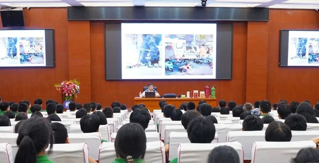 汤教官运用通俗易懂的语言,从近年来发生的大型火灾案例着手进行详细剖析,让学子们深刻体会到火灾的危险性和残酷性,告诫大家不要忽略生活中的微小细节,一个插座、一个充电器、甚至一小节电池都有可能成为引发火灾的诱因。因此,他希望学子们一定要严格遵守日常校园教室、寝室及家里的用火、用电、用气等安全事项,警钟长鸣,防微杜渐。