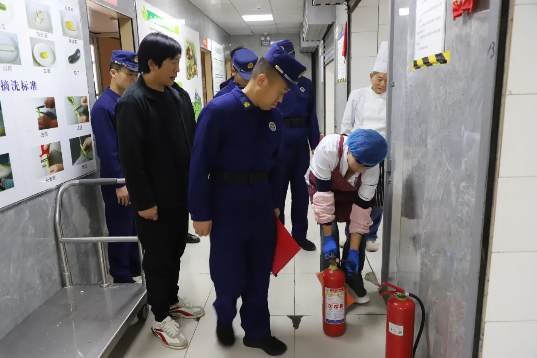 在餐厅区域,消防救援人员不仅检查了消防设备的配备情况,还特别对餐厅工作人员进行了消防器械使用抽查。通过现场演示和提问,检查餐厅工作人员对灭火器等消防器械使用方法的掌握情况。