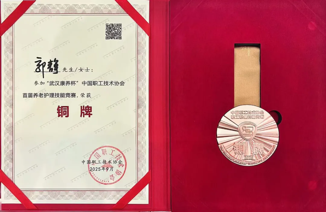 郭静老师在个人赛中表现尤为突出,从居家、机构到社区三个考核模块,始终保持稳定发挥,以细腻的服务态度和精湛的护理技能脱颖而出,最终摘得个人铜牌,为我院赢得了荣誉。