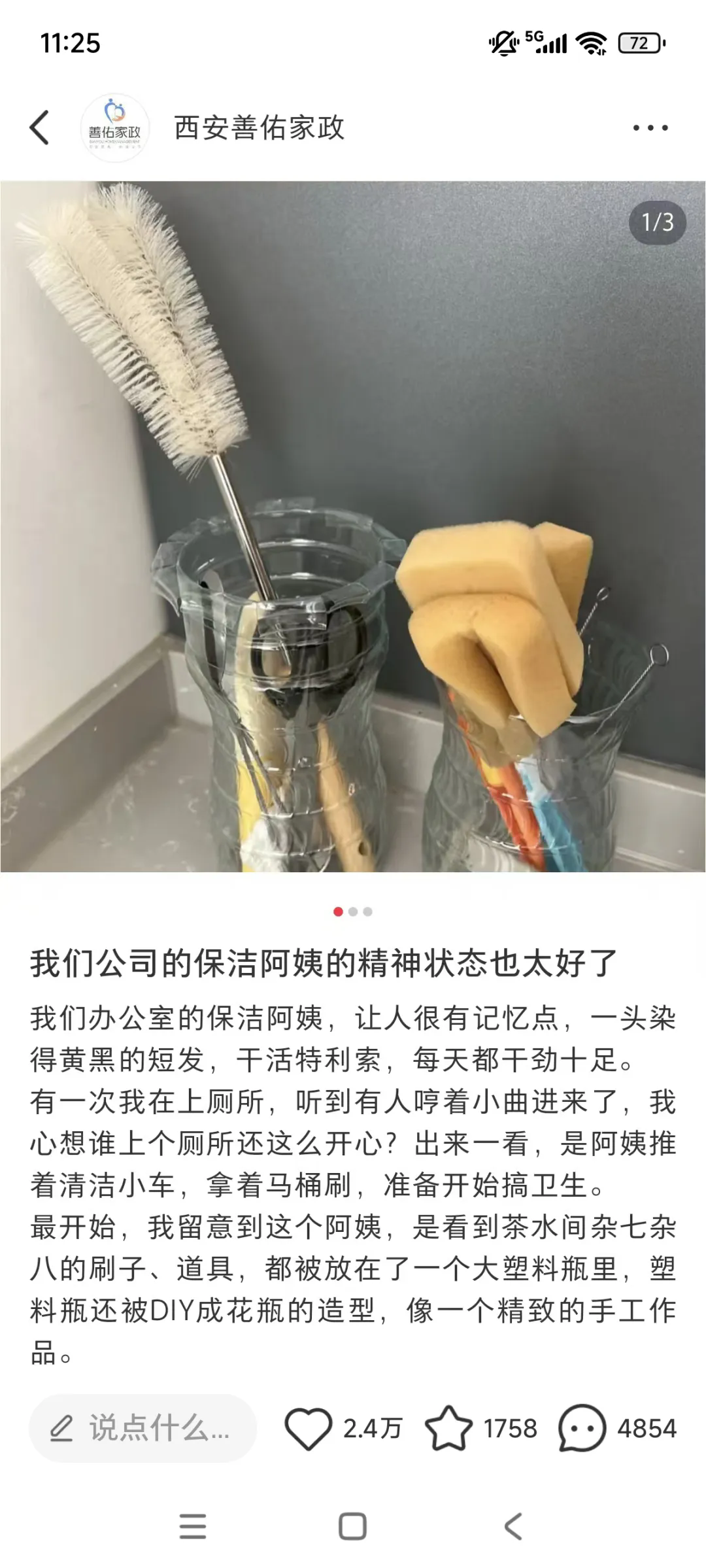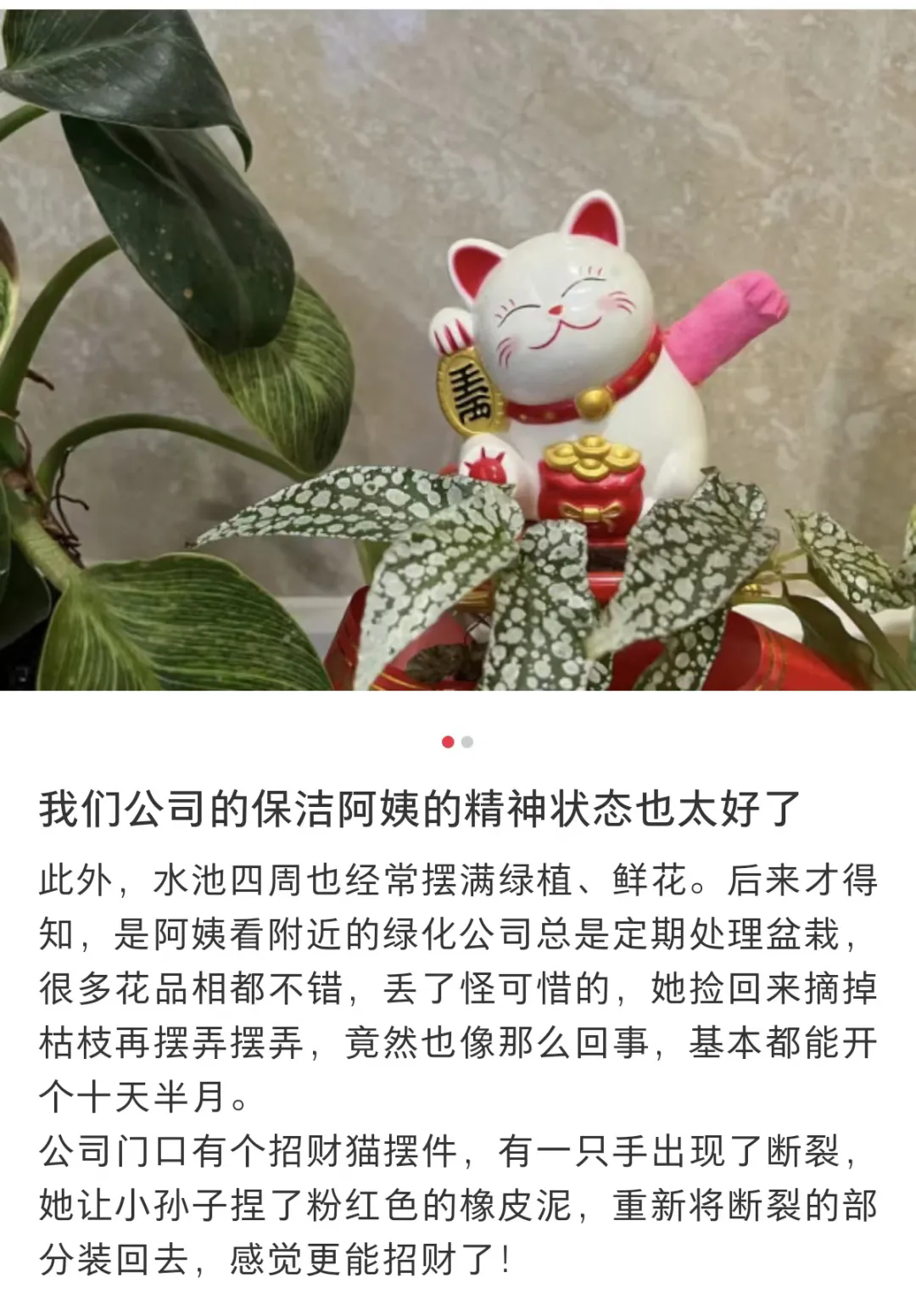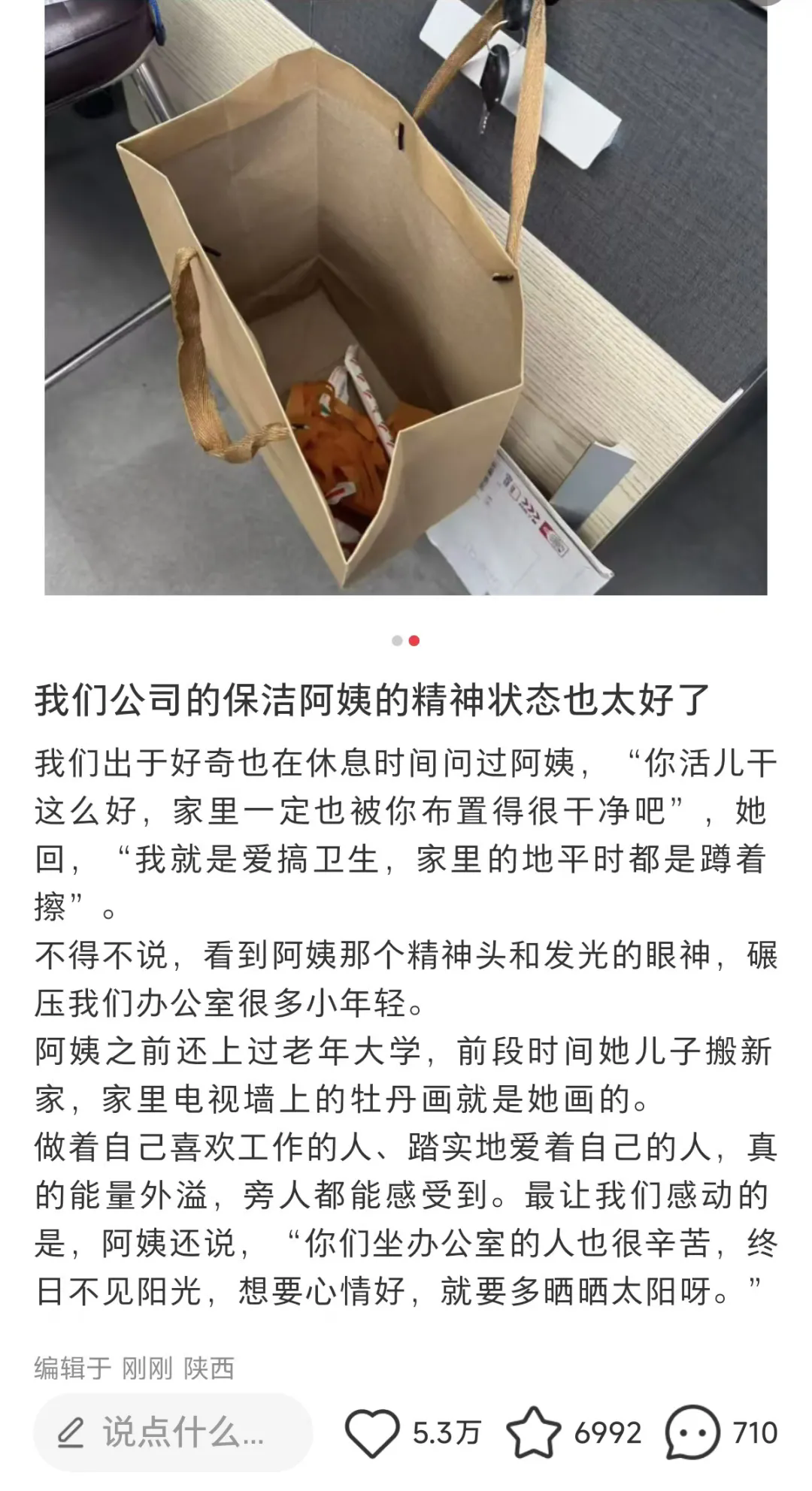 最近,网上一个关于公司保洁阿姨的帖子特别火,帖子里分享了阿姨如何把一份普通的工作干得充满热情和成就感。很多看了帖子的年轻人都说,被这种朴素的职业精神深深触动,甚至缓解了自己的“精神内耗”。