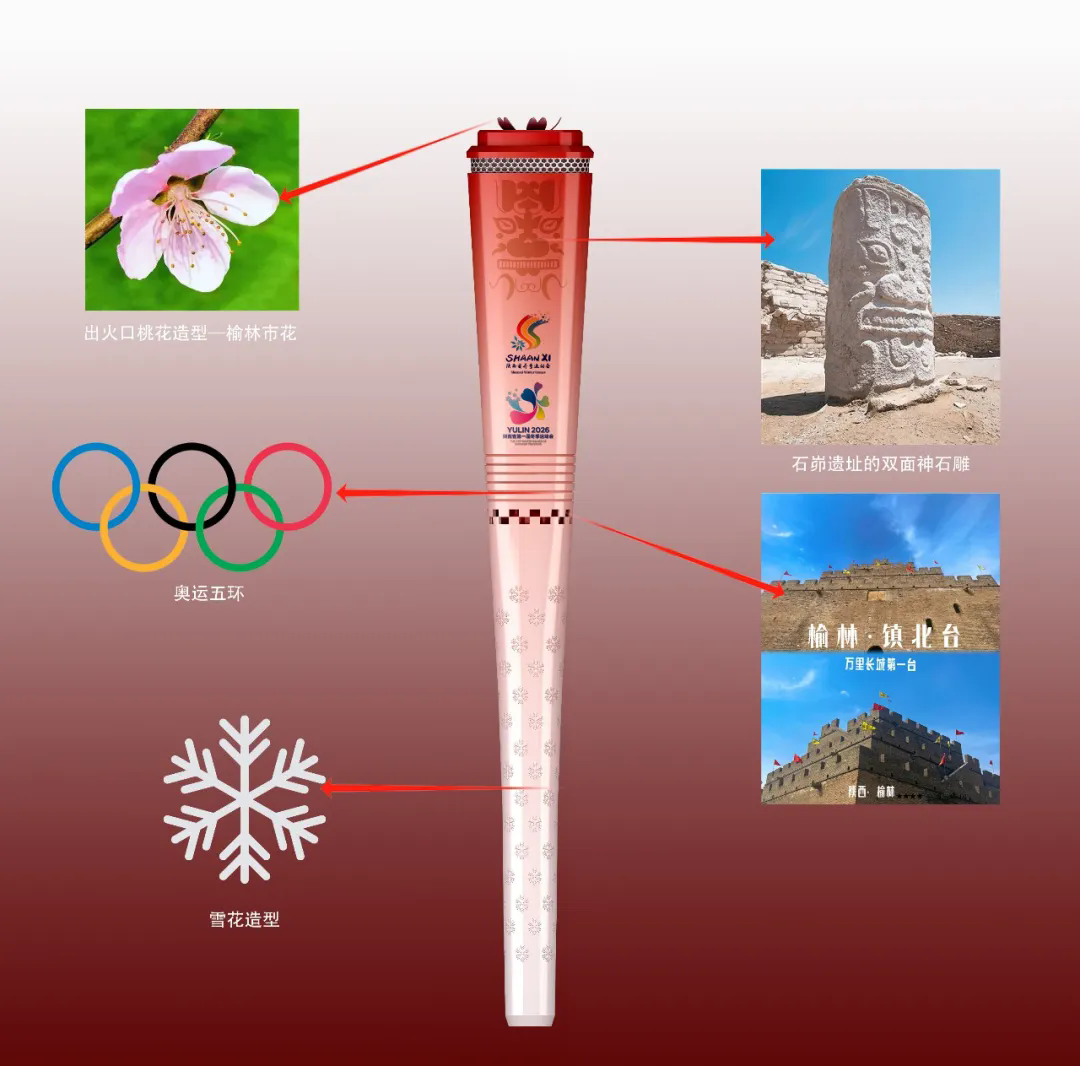 火炬中部,由奥运五环巧妙演化而成的同心圆环依次而下,既呼应着奥林匹克的全球精神,又象征着榆林人民同心同力、团结携手,共同托起这簇属于陕西冰雪梦想的圣火。中段造型更融入了榆林标志性建筑“镇北台”的雄浑意象。中间环绕的一圈城垛纹样,犹如历史长河中的烽火台,默默诉说着边塞的沧桑与坚韧,赋予火炬以鲜明的地域文化品格。它不仅是运动的象征,更成为榆林深厚历史底蕴的生动载体。
