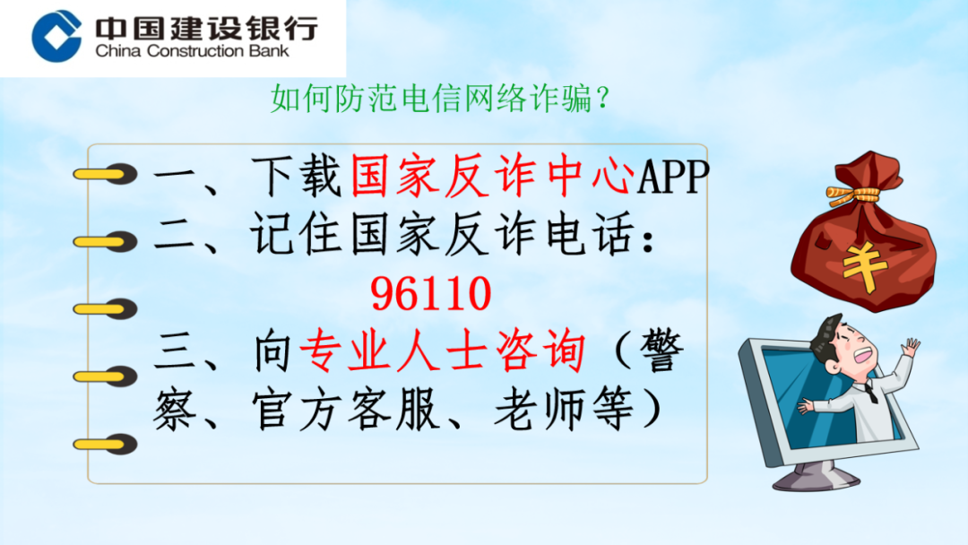 讲座现场,建行宣讲老师从常见诈骗手段种类、什么是反洗钱、避诈骗陷阱“三不要”、怎样保护自己远离洗钱风险、防范非法网贷、校园贷、套路贷等方面引导同学们如何提高风险意识、防范金融诈骗,并通过精彩的案例分析、宣传视频进行全方位辅助宣讲。