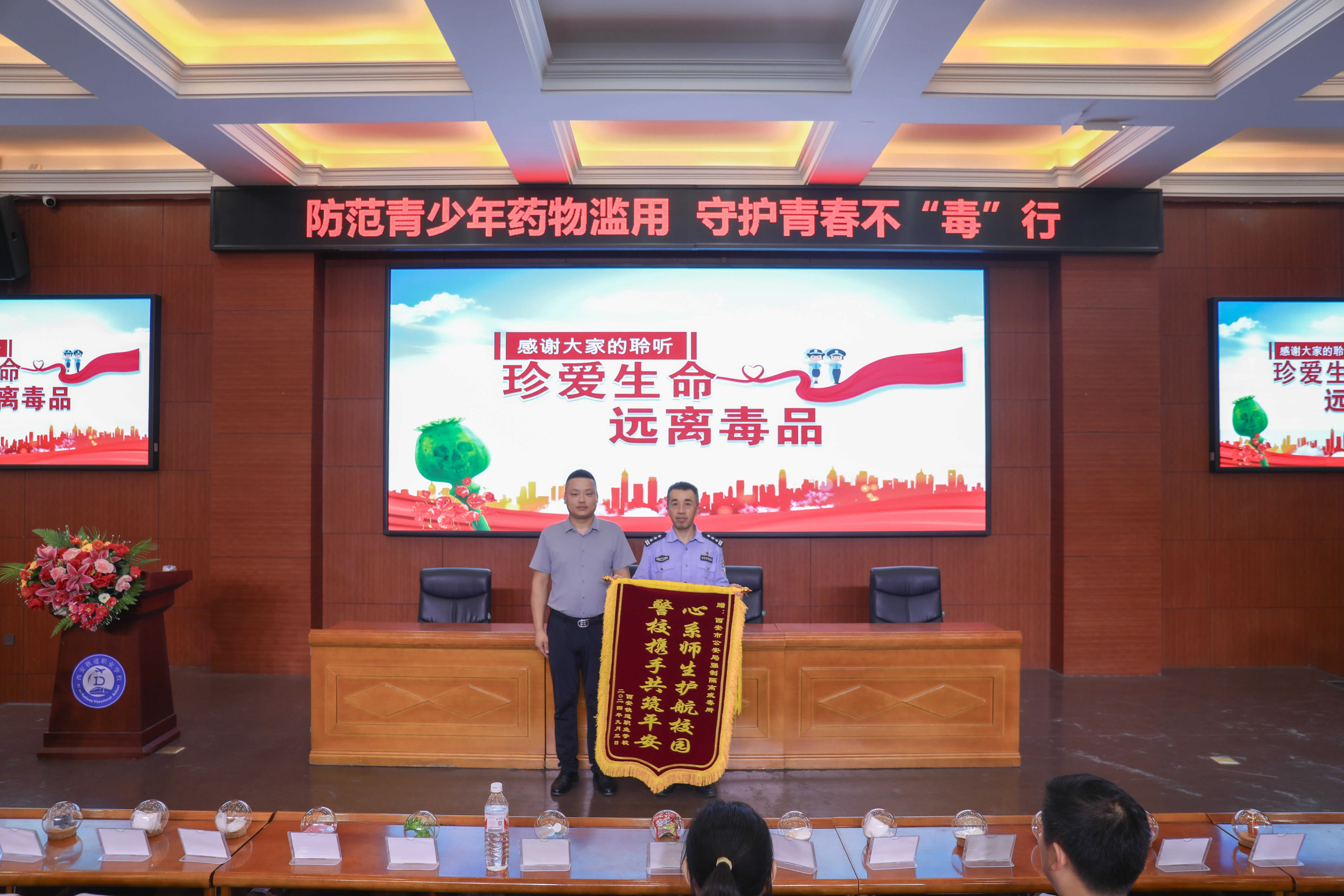 为感谢市局戒毒所对我校毒品预防宣传教育工作的支持,特向市局戒毒所赠送锦旗一面。